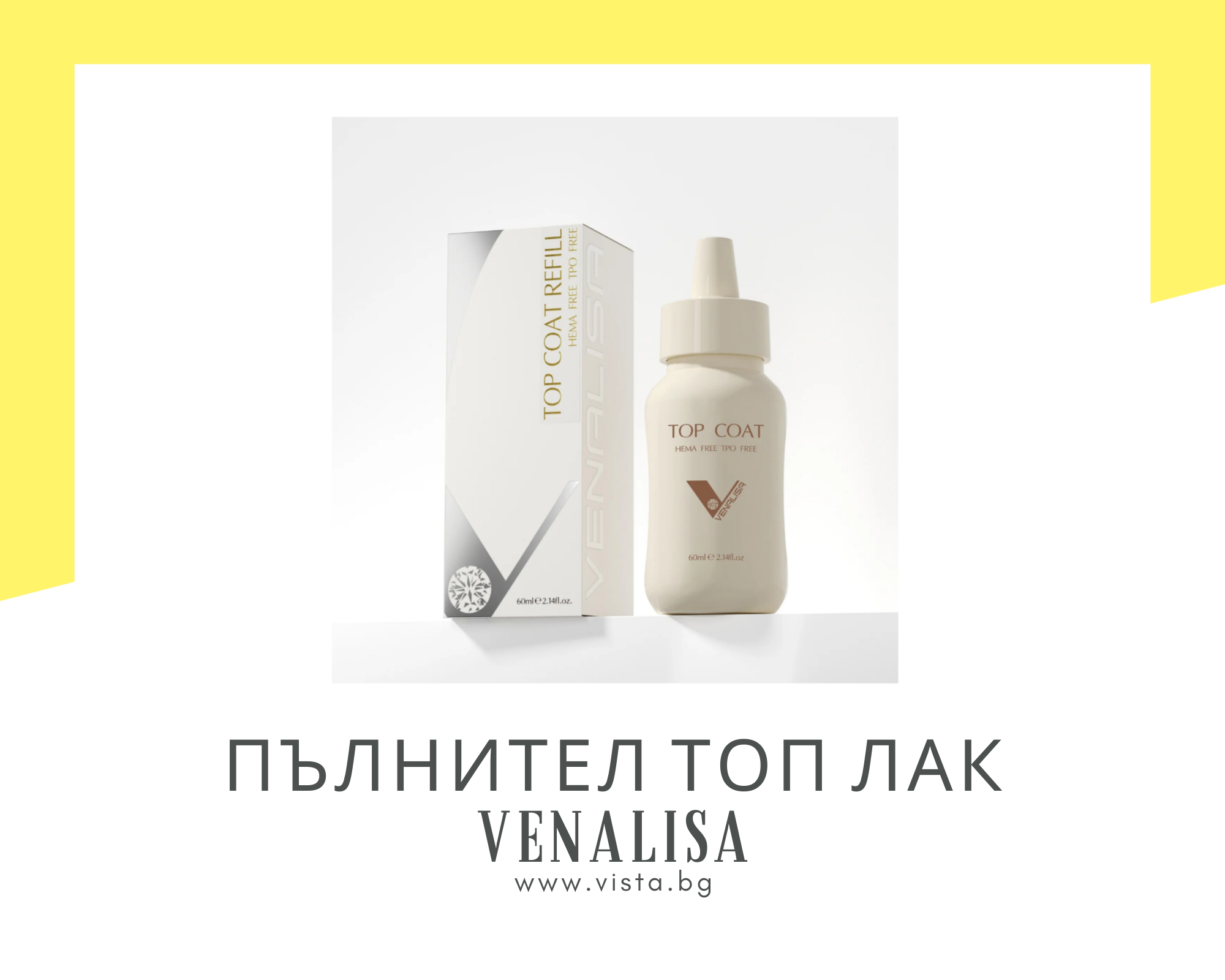 Висококачествен хипоалергенен лъскав топ лак без лепкав слой на марката VENALISA, осигуряващ блясък и дълготрайност на маникюра ви. Продуктът се предлага в разфасовка от 60 мл. пълнител.