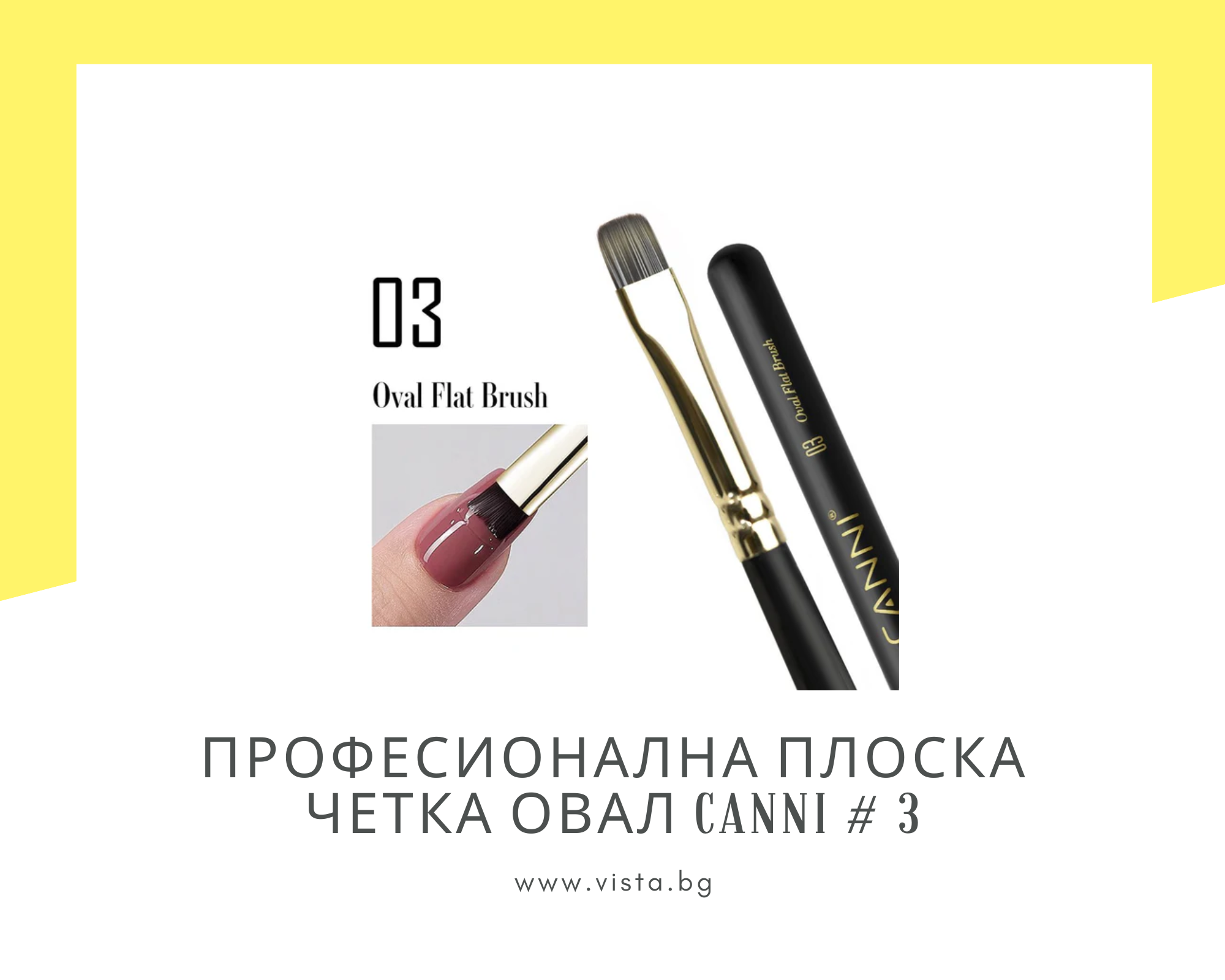 Професионална плоска четка с овална форма CANNI #3, създадена за гладко и прецизно нанасяне на гел, гел лак или база. Овалният връх позволява лесно следване на линията на кожичките и осигурява равномерно покритие без излишен натиск. Изработена от висококачествени синтетични влакна, четката запазва формата си дълго време и предлага отличен контрол при работа. Ергономичната дръжка е лека, удобна и устойчива на почистващи препарати и дезинфектанти, което гарантира дълъг експлоатационен живот. Подходяща е както за професионална употреба, така и за домашни маникюри.