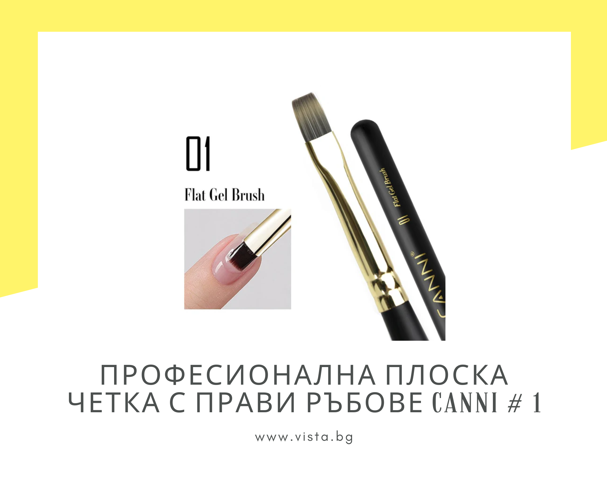 Професионална плоска четка с прави ръбове CANNI #1, проектирана за равномерно и прецизно нанасяне на гел, гел лак или база. Плоската форма с изцяло прави ръбове позволява лесно покриване на по-големи повърхности, както и работа близо до кожичките без разливане на материала. Изработена от висококачествени синтетични влакна, четката запазва формата си дълго време и осигурява отличен контрол по време на работа. Ергономичната дръжка е лека и удобна, устойчива на въздействието на почистващи препарати и дезинфектанти, което гарантира дълъг живот на инструмента.