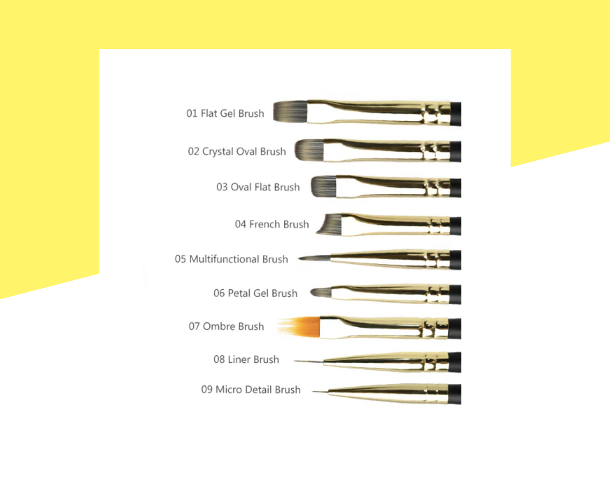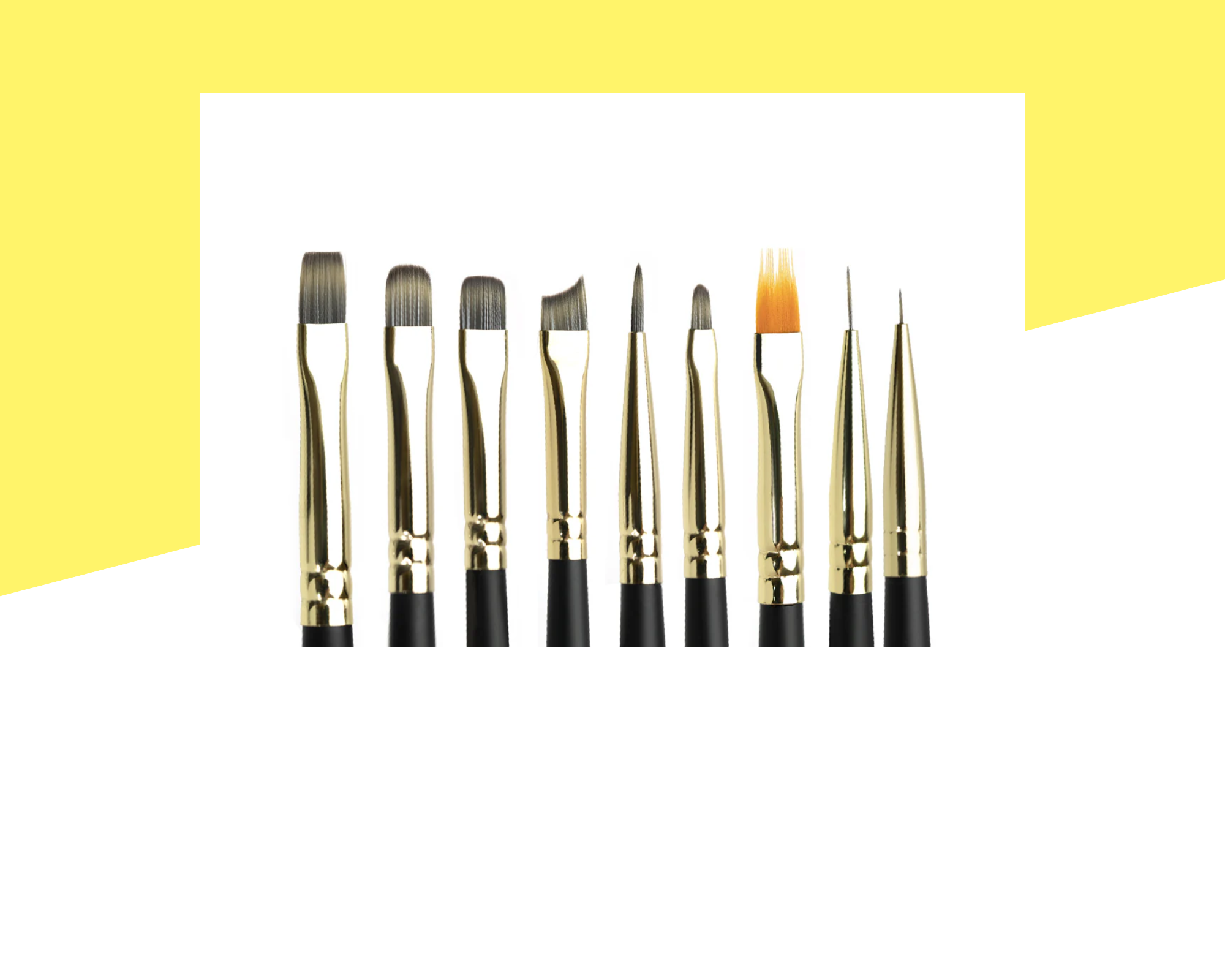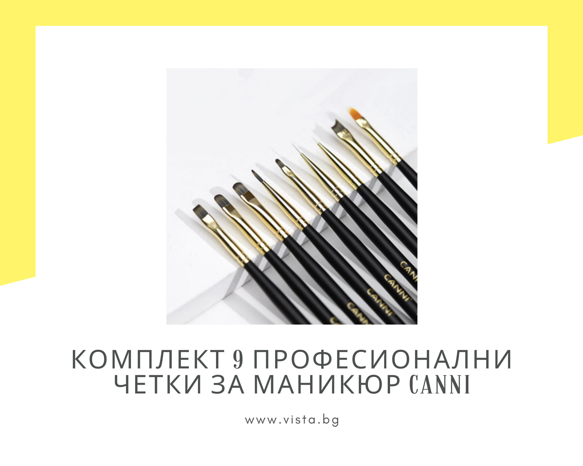 Комплект от 9 професионални четки за маникюр на марката CANNI, предназначени за прецизна работа при изграждане, декорация и дизайн на нокти. Комплектът включва разнообразни форми и размери четки, подходящи за работа с гел, гел лак, акрил, полигел и декоративни елементи. Четките са изработени с висококачествен синтетичен косъм, който осигурява равномерно разнасяне на продукта, прецизност при рисуване и дълготрайна употреба. Ергономичните дръжки осигуряват удобен захват и стабилен контрол, което ги прави подходящи както за професионални маникюристи, така и за начинаещи. Комплектът е идеален за създаване на детайлни рисунки, френски маникюр, омбре ефект, линии, орнаменти и 3D декорации.