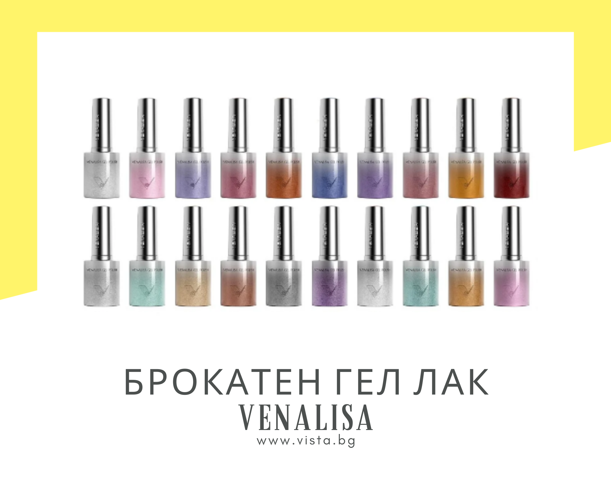 Професионален висококачествен брокатен гел лак Venalisa в гама от 25 блестящи цвята и разфасовка от 10 мл. Гел лакът се отличава с наситена пигментация и фин брокатен ефект, който придава изискан блясък и дълбочина на цвета. Осигурява равномерно и плътно покритие още с първия слой, без ивици и неравности. Формулата е устойчива на надраскване и лющене и гарантира дълготраен бляскав ефект до 3 седмици. Подходящ е както за ежедневен, така и за празничен маникюр, като запазва интензитета и блясъка на цвета през целия период на носене. Предлага се в подбрана колекция от 25 брокатени нюанса – от нежни и елегантни тонове до наситени и ефектни цветове, подходящи за всеки стил и сезон.