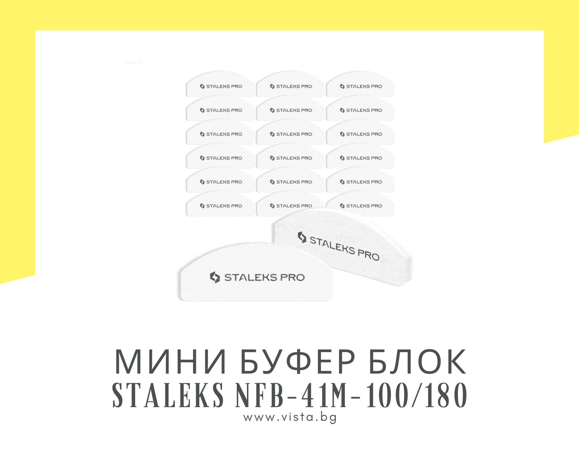 Професионален мини буфер блок Staleks NFB-41m-100/180, предназначен за оформяне, матиране и подготовка на нокътната плочка при маникюр и педикюр. Компактният размер осигурява прецизна и удобна работа, особено при детайлна обработка и в труднодостъпни зони около нокътя. Двустранната абразивност 100/180 грит позволява универсална употреба – 100 грит за по-интензивна обработка и оформяне, а 180 грит за заглаждане и фина подготовка преди нанасяне на база, гел лак или изграждащи материали. Буферът осигурява равномерна и контролирана обработка, без излишно изтъняване на нокътната плочка. Комплектът съдържа 20 броя, което го прави практично решение за професионални салони и поддържане на високи хигиенни стандарти.