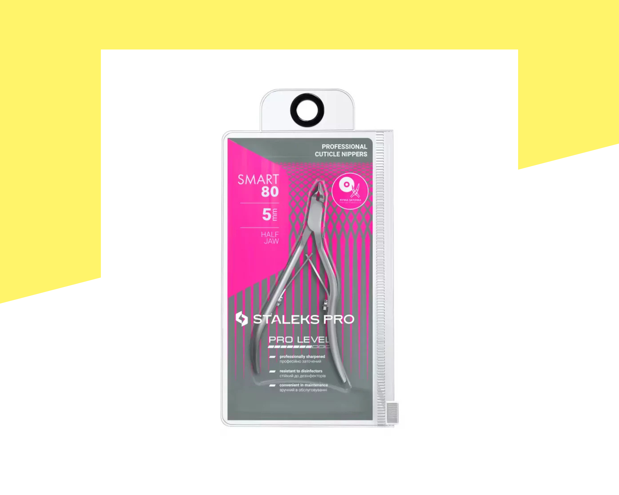 Висококачествени професионални ножички за кожички Staleks Smart Pro NS-80-5, предназначени за прецизна, стабилна и комфортна работа при маникюр и педикюр. Фино извити и удължени остриета осигуряват отлична видимост и контрол, което позволява безопасно и точно изрязване на кожичките. Ръчно заточените режещи ръбове гарантират чист, гладък разрез без дърпане и накъсване. Високата твърдост на метала позволява на остриетата да запазят остротата си за дълъг период, дори при интензивна професионална употреба. Инструментът е устойчив на корозия, благодарение на висококачествена полировка, и е изработен от медицинска неръждаема стомана, подходяща за дезинфекция и стерилизация.