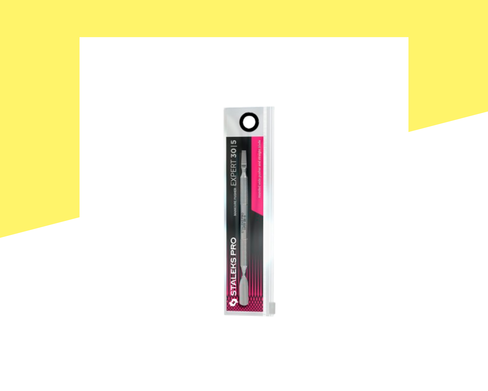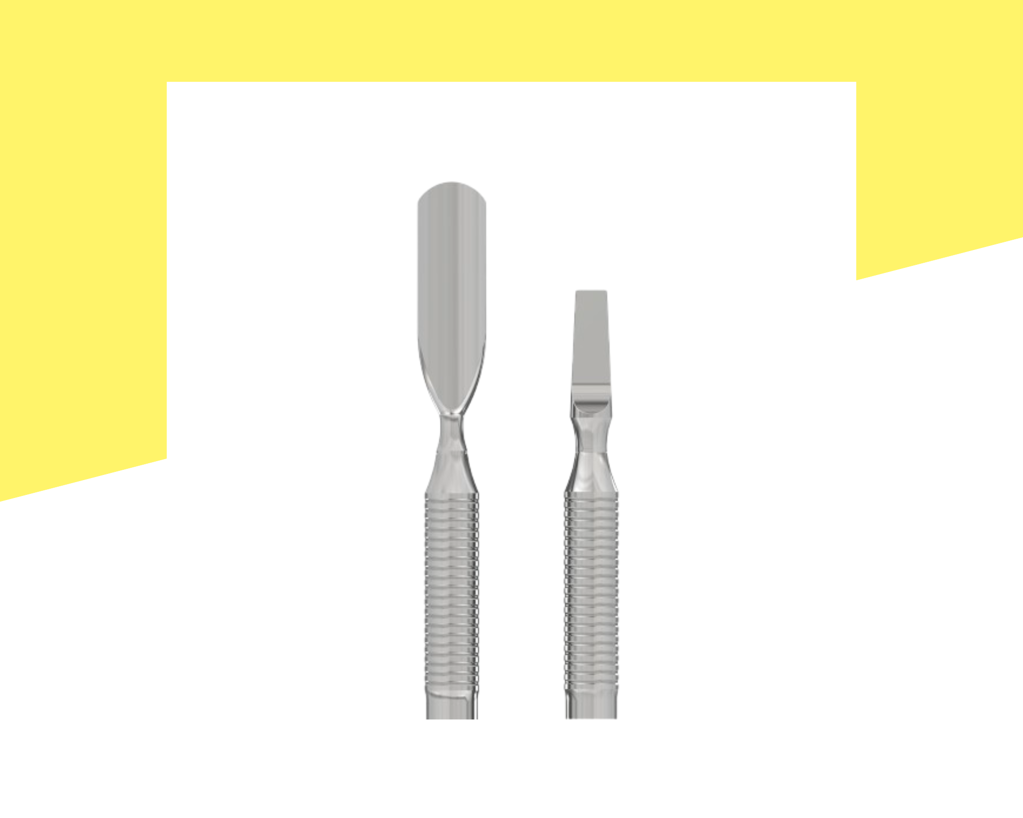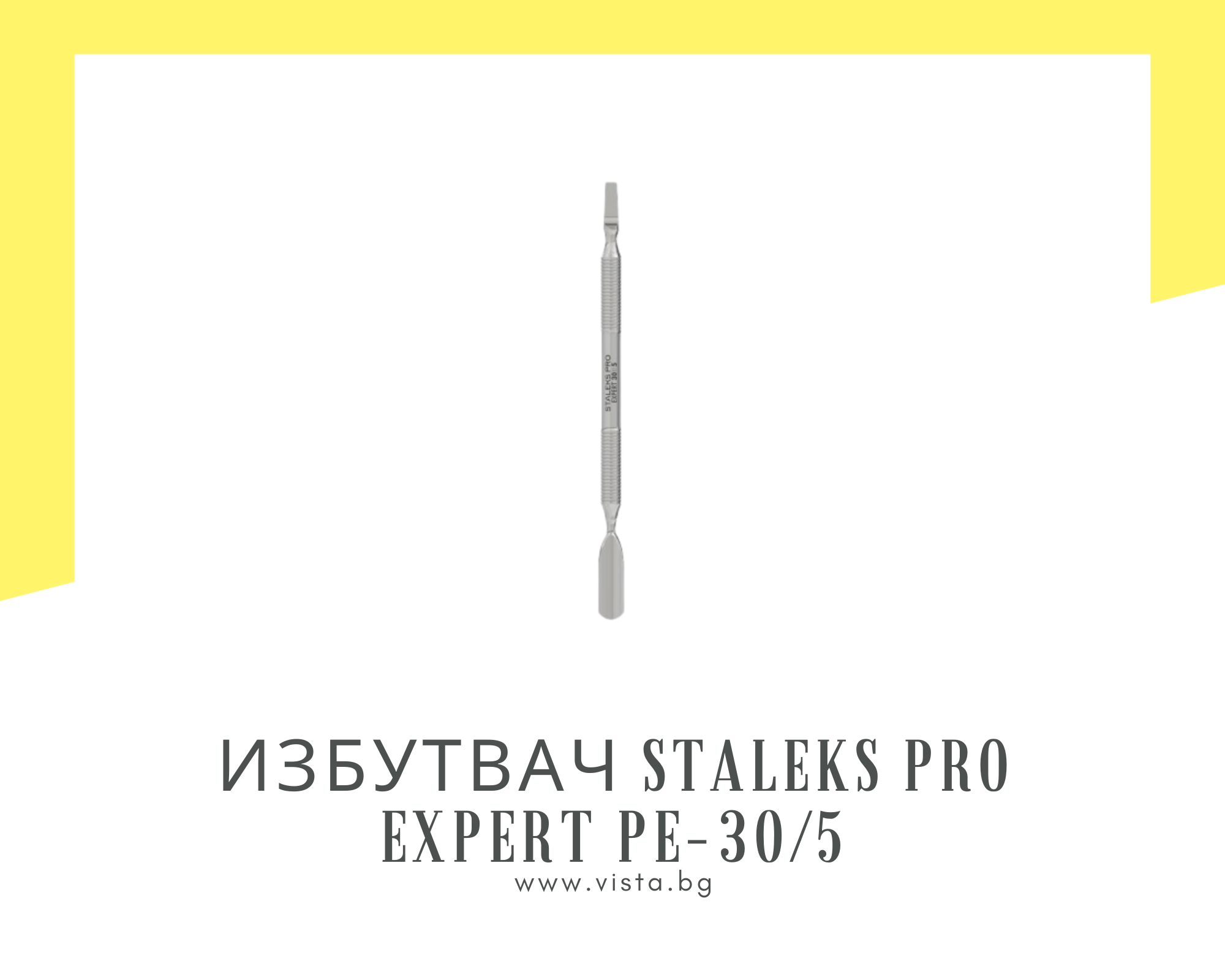 Професионален избутвач за кожички Staleks Pro Expert PE-30/5, предназначен за деликатно избутване на кожичките и прецизно почистване на нокътната плочка при маникюр и педикюр. Инструментът разполага с две работни части – заоблен широк избутвач и право острие, които позволяват ефективно обработване на кутикулата и почистване на нокътната плочка от излишна кожа и замърсявания. Широкият избутвач осигурява удобно избутване на кожичките, а правото острие е подходящо за по-прецизна работа и почистване в труднодостъпни зони. Ергономичната дръжка с противоплъзгаща текстура гарантира стабилен захват и отличен контрол, което прави инструмента подходящ за професионална употреба. Изработен е от висококачествена медицинска неръждаема стомана, устойчива на корозия и подходяща за дезинфекция и стерилизация.