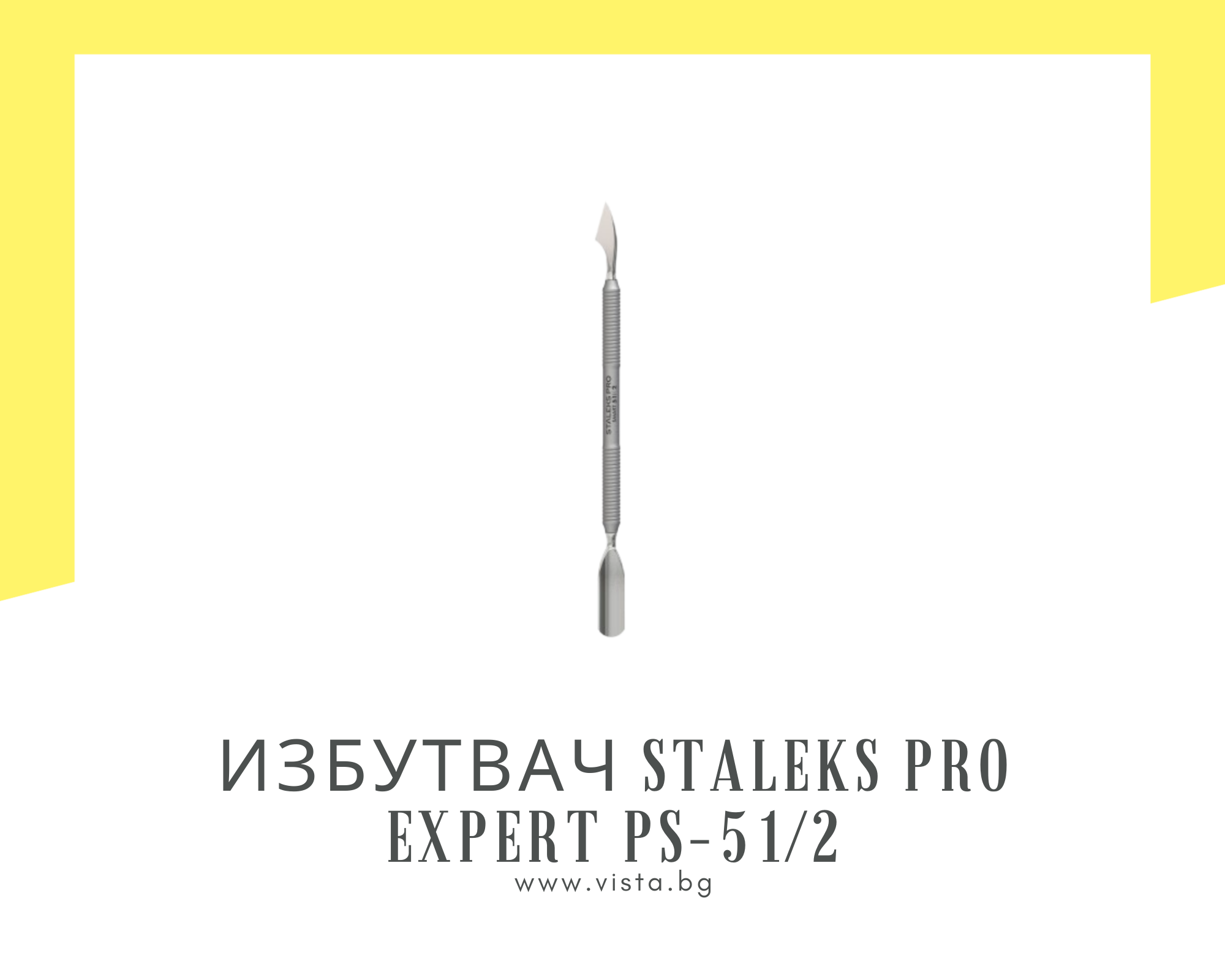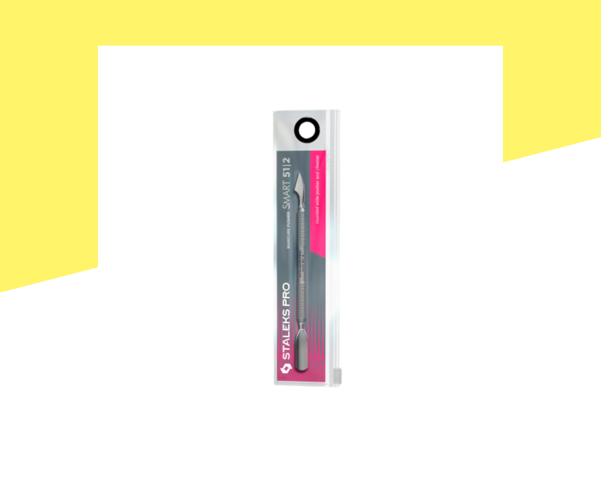 Професионален избутвач за кожички с накрайник за почистване Staleks Pro Expert PS-51/2, предназначен за деликатно избутване на кожичките и прецизно почистване на нокътната плочка при маникюр и педикюр. Инструментът разполага с две функционални работни части – заоблен избутвач и почистващ накрайник (тип „брадвичка“), които позволяват ефективно повдигане и избутване на кутикулата, както и премахване на птеригиум и замърсявания от нокътната плочка. Формата на избутвача следва естествената извивка на нокътя, което осигурява по-добър контакт и безопасна работа, а почистващият край позволява прецизна обработка в зоната около и под нокътя. Ергономичната дръжка с противоплъзгаща текстура гарантира стабилен захват и отличен контрол по време на работа. Изработен е от висококачествена медицинска неръждаема стомана, устойчива на корозия и подходяща за дезинфекция и стерилизация.